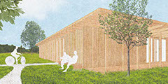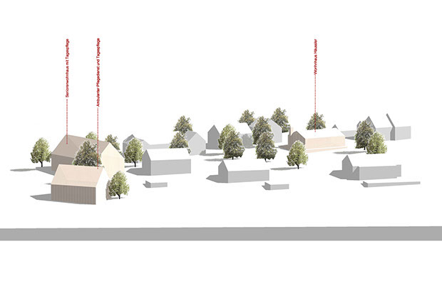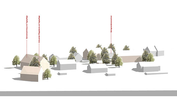 Anstelle einer alten Scheune, eines bestehenden Gasthofes und eines Wohnhauses wird durch Rückbau der Scheune unter Verwendung der alten Bauteile wie Dachstuhl, Fachwerk und Naturstein, ein neues Senioren-Wohngebäude geplant. Der ehemalige Gasthof wird den ambulanten Pflegedienst beherbergen und hier eine Tagespflege mit Gartennutzen mit zur Verfügung stellen. Das Bestandswohnhaus wird nach einem Abriss als zweigeschossiger Neubau mit Dachausbau Platz für etwa 8 bis 10 Wohneinheiten bieten. Stellplätze können überwiegend im Sockelgeschoss untergebracht werden.