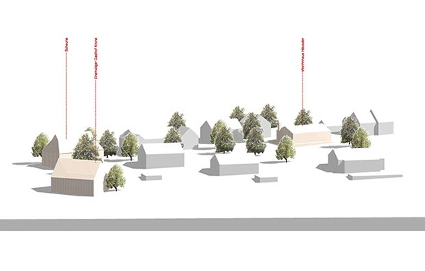 Bestehende Situation mit der alten Scheune, dem ehemaligen Gasthof und dem Wohnhaus