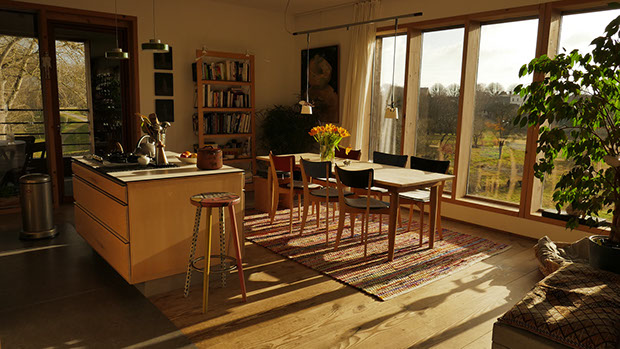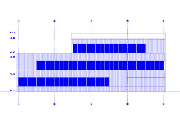 Betonskelett- und Geschossebenen mit Holzrahmen-Aussenverkleidung und -Innenwände; auf einer Grundfläche von nur 350 m2 finden sich auf zwei Geschossebenen Werkstatt- und Lagerflächen mit LKW-Anlieferungsmöglichkeit sowie ein on-top-of-the-roof Penthouse. Eine geräumige Wohnung mit Rundumblick über die Stadt und großzügiger Dachterrasse auf der 3. Geschossebene. Hier bleiben für junge Unternehmer-Familien keine Wünsche offen. Die Wohnung bietet zudem einige innovative Gestaltungs- und Ausbauideen. So gibt es beispielsweise keine Fliesen, keine surrende Lüftungstechnik und keine überdimensionierten Kunststofffensterrahmen. Ganz nebenbei: es überkommt einem Gast beim Betreten der Wohnung sogleich ein warmes und sehr wohnliches Willkommens-Ambiente um nicht zu sagen eine gewisse Urlaubsstimmung umwebt den Besucher.